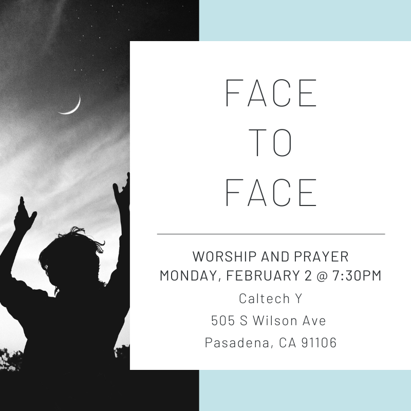 Face to Face is a space where we encounter God intimately in worship and speak to God just as Moses did, as one speaks to a friend (Exodus 33:11). Come for a time of worship and prayer, as we spend some face-to-face, heart-to-heart time with God. Our theme will be light, and we’ll spend time praying for the parts of our lives and world that need the light of Christ. We’ll be meeting on Monday, February 2 @ 7:30pm at the Caltech Y (505 S Wilson Ave, Pasadena, CA 91106). Bring a friend!