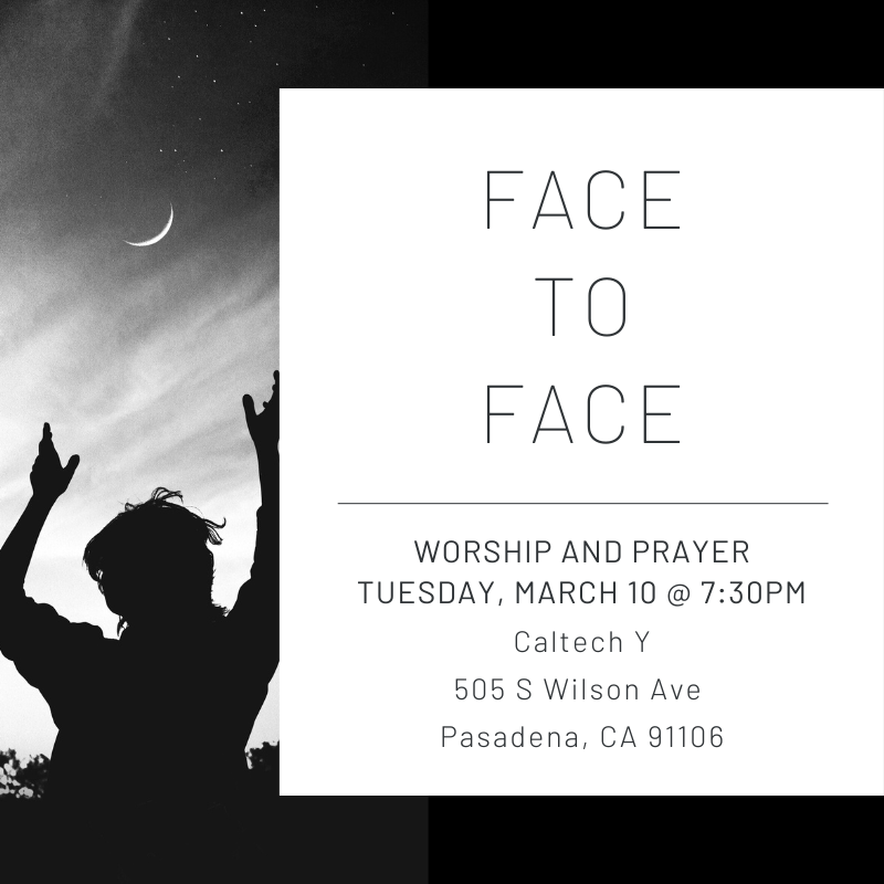 Face to Face is a space where we encounter God intimately in worship and speak to God just as Moses did, as one speaks to a friend (Exodus 33:11). Come for a time of worship and prayer, as we spend some face-to-face, heart-to-heart time with God. Our theme will be turning in light of Lent. We’ll be meeting on Monday, March 10 @ 7:30pm at the Caltech Y (505 S Wilson Ave, Pasadena, CA 91106). Bring a friend!